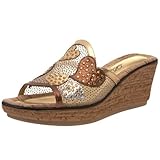 Slide into this embellished cork-like wedge from Dezario. The lightweight, textured platform is surmounted with straps that are decorated with studded floral accents and scalloped trim. It's perfect for adding some fanciful flair to warm-weather wear. |